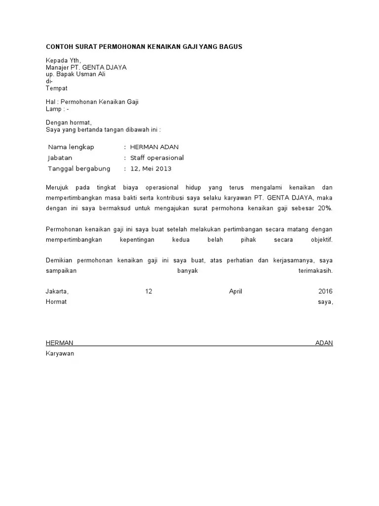 Doc contoh surat permohonan kenaikan gaji yang bagus gusrini rubiyanti. Contoh surat pengumuman kenaikan gaji karyawan. Berikut ini adalah cara pembuatan dan contoh surat kenaikan gaji yang bisa anda pelajari ketika ingin mengajukan kenaikan gaji kepada . Surat pemberitahuan ini disampaikan kepada karyawan supaya bisa dibaca, dicermati,.